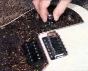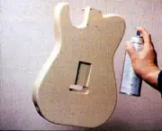 dijo:El acabado Le dimos un acabado a la guitarra con un esmalte y un imprimado acrílico, que puede encontrar en latas rociadoras en las tiendas de accesorios de automóviles (vea lista de materiales en la página 93). Siga las instrucciones de la etiqueta del producto. provea adecuada ventilación y use un respirador cuando use pinturas rociadoras. Si es posible, trabaje al aire libre. Después de lijar el cuerpo con papel de grano 220, aplique 10 capas de imprimado. Deje que se seque una semana y líjela con un papel húmedo / seco de grano 400, usando agua como lubricante y un pedazo de espuma rígida como bloque lijador. Tenga a mano tres latas del color del acabado y aplique capas ligeras, hasta que la última lata se vacié (Foto 18). Después de una semana, lije con lija húmeda de grano 400 hasta que todas las imperfecciones de la superficie sean eliminadas (Foto 19). Siga con papel de lija de grano 600 y entonces utilice un compuesto de pulir carrocerías de automóviles (siga las instrucciones del producto). Termine el mástil primeramente encintando el diapasón y aplicando 10 capas de laca transparente en lata rociadora, que venden en ferreterías y tiendas de pinturas. Entonces, una el mástil al cuerpo. Instale el trémolo de manera que el cuerpo del trémolo esté libre para pivotar en los tornillos de montaje y no toque los lados de las ranuras. Apriete los tornillos solamente hasta que hagan contacto con la unidad, e instale los muelles y su montaje. Ponga en su lugar la placa del clavijero y la arandela cuadrada. Instale el clavijero y coloque el protector al cuerpo. Enrosque el alambre de tierra al montaje de los muelles y asegúrelo detrás del tornillo del montaje. Dele vueltas completamente a cada eje de Potenciómetro en el sentido de las manecillas del reloj y apriete los botones con el No.10 de cara hacia arriba (Foto 20). Instale las clavijas y el fiador de las cuerdas como se muestra (Foto 21 ). Con una lima grande lime los trastes a la misma altura. Mueva la lima a 10 largo de los trastes hasta que aparezca una pequeña marca plana en la parte de arriba de cada uno (Foto 22). Cubra con cinta la madera de palo de rosa entre los trastes y use papel de lija de grano 400 y 600 para redondear y suavizar la parte superior de los trastes. Dele un acabado aplicando una capa de aceite tung al palo de rosa.
