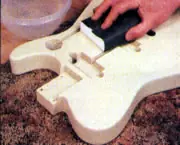 11. Desbaste usando una broca de émbolo buzo con un buje de guía, siguiendo la plantilla de madera terciada, y vaya recortando todas las cavidades (se muestra la ranura del trémolo).