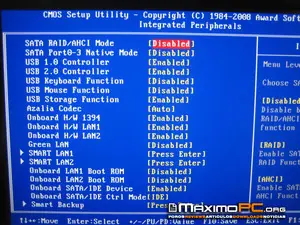 Para configurar los periféricos integrados debemos dirigirnos a esta pantalla donde se encuentran los puertos USB, Sonido, LAN y por supuesto los de SATA. Prácticamente armar un RAID es una tarea simple con la tecnología Intel Matrix Storage (al que podemos acceder también desde el sistema operativo).