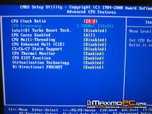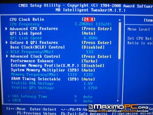 La pantalla M.I.T es realmente completa con gran cantidad de opciones para manipular hasta el más mínimo detalle. Al poseer un procesador Extreme podemos cambiar el valor del multiplicador (ya que está desbloqueado); también figura el QPI y el Base Clock Control (bus) cuyo valor inicial es de 133 MHz. De forma particular, podemos acceder a las tecnologías del CPU como el Turbo Boost, Multi-threading (8 hilos de procesamiento) C1E / EIST (ahorro de energía ) y la función de virtualización.