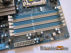 Presenta seis ranuras de memoria DDR3 para formar la tecnología Triple-Channel (del mismo color) con una capacidad máxima de 24GB funcionando a velocidades de 2100+/1333/1066/800 MHz lo cual indica que podemos practicar Overclocking en este segmento siempre y cuando el procesador lo soporte (dado que tiene el controlador de memoria integrado) siendo recomendable no sobrepasar 1.65v de voltaje aunque no quita que el EX58-EXTREME puede dar mucho más.