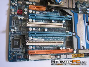 Para la sección de expansión, contamos con dos ranuras PCIe de 16x y un PCI de 8x (naranja para diferenciar) para aquellos entusiastas que buscan formar el sistema 3-Way SLI de Nvidia (también soporta CrossfireX gracias al chipset X58). También disponemos de un PCIe de 1x, otro de 4x (naranja) y finalmente dos ranuras PCI que siempre vienen bien. En el extremo izquierdo se localiza otra tecnología de Gigabyte denominada Dual-Bios para regresar intacto de problemas del Bios en caso de actualización u overclocking fallido.