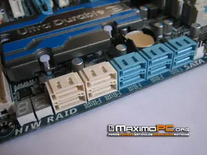 Para aumentar la eficiencia, Gigabyte ha decidido unificar el disipador cubriendo tanto al SB ICH10R como al controlador JMicron JMB322. Por un lado el SB se encarga de seis puertos SATA 2 azules (3Gb/s) soportando RAID 0,1,5,10 ubicados en forma de 90 grados para evitar problemas con la instalación de tarjetas gráficas de gran envergadura. Por otro lado, el chipset Gigabyte SATA 2 controla los dos puertos SATA blancos restantes (RAID 0,1). Este último también se encarga del IDE lo cual explica su cercanía. ¿Con todo esto es suficiente verdad?