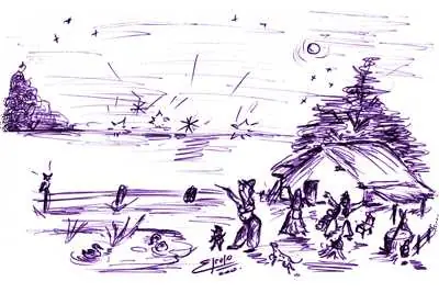 Los pobres indios no tenían animales de labranza y sólo con sus manos y unas pocas herramientas trabajaban la pedregosa tierra. “Sin embargo, a fuerza de trabajo, lograban sacar lo necesario para subsistir precariamente. “Con eso y con la ayuda de Coquena que los proveía de aves y peces, llamas, guanacos y vicuñas, transcurría tranquila su vida, ya que no en la abundancia, por lo menos cubiertas sus más urgentes necesidades. “No pedían más al cielo ni era su sueño turbado por ninguna ambición. “Pero de pronto se desataba el invierno, cuando en medio del valle comenzaban a surgir géiseres y fumarolas y las aguas de los canales que surcan el valle se volvían calientes, termales. “Corrían aterrados los indígenas a ofrecer sus tributos al volcán, coronado ya por el humo que permanentemente se escapaba de sus fauces.