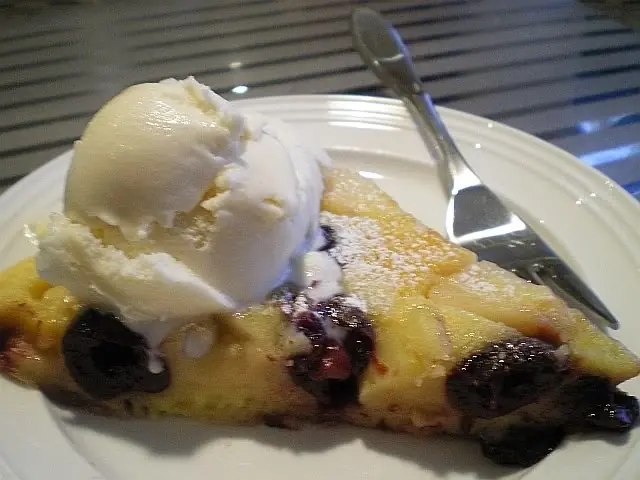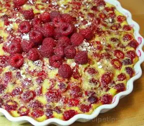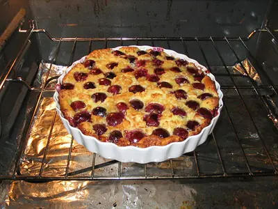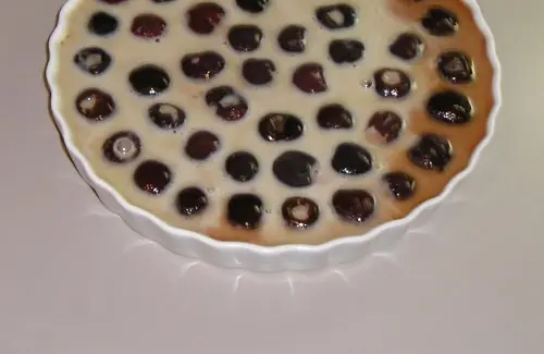 El clafoutis es originario de la región francesa de Limousin, cuya capital es Limoges, y consiste en una masa blanda, como para hacer crepes o panqueques, que se vierte en una fuente con frutas (el tradicional de de cerezas) y se cocina en el horno.