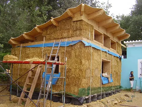 * Construcción de viviendas con fardos de paja: Uno de los materiales mas antiguos usados en la construcción de viviendas es la paja que en nuestros años modernos es enfardada y usada en construcciones de viviendas autosoportante o no soportante del techo.