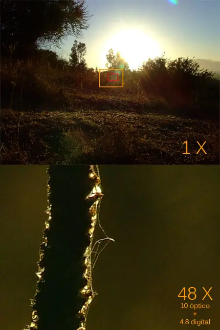 Luego tenemos el zoom digital, en donde la cámara toma la foto y el procesador de ésta toma la imagen y la interpola (estira) dándote ese “zoom”. El problema con este método es que la calidad es horrible debido a que la generación artifical de pixeles quita detalle en la imagen y a la vez agrega ruido respecto al zoom óptico. Esto se debe a que ya se produce una interpolación al capturar la imagen en el sensor y someter a una interpolación mayor hace aún más notorios los efectos secundarios de ésta. Puedes obtener resultados muchísimo mejores utilizando software especializado como Photoshop, GIMP o PhotoZoom Pro.
