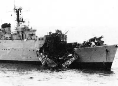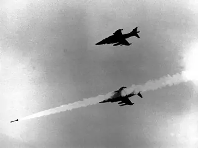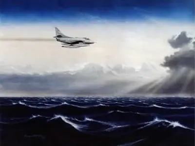 Casi rozando las olas y a cerca de 1000 Km. por hora, los pequeños reactores se dirigieron con determinación contra sus blancos, abriendo fuego de cañón aun antes de encontrarse a distancia de tiro eficaz. Casi simultáneamente, el aire se llenó de explosiones en torno a los aviones argentinos y hacia ellos subían, vertiginosas, las trazas de la defensa antiaérea. El agua en las proximidades hervía con las pequeñas columnas blancas de los proyectiles de la artillería británica y las balas de cañón de los aviones atacantes levantaron una alfombra espumosa que se desplazó velozmente hacia los buques.