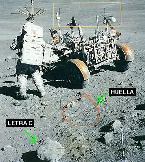 Foto 8: Apolo 16, las huellas del vehículo dejadas sobre la superficie son incongruentes con la posición que muestra el vehículo espacial en la foto. Además, en la piedra se observa una letra C impresa.