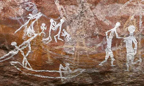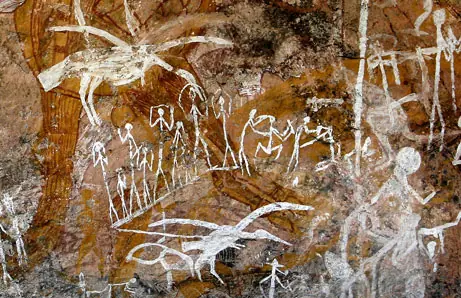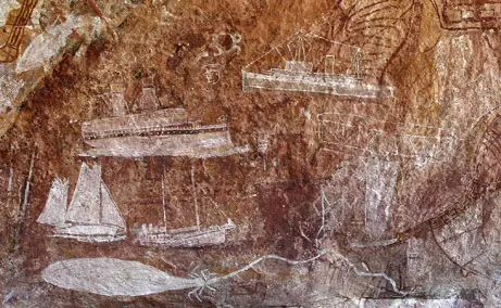 Este pasado verano, científicos de la Universidad Griffith en Queensland (Australia) acompañados del anciano aborigen Ronald Lamilami, llegaron al lugar en el que todas esas crónicas “rupestres” dejaron constancia intemporal de lo que otros habían visto. El dibujo que ilustra este post, representa probablemente un vapor con misioneros europeos del siglo XIX (los aborígenes asocian el gesto de apoyar las manos en la cadera con los nativos del viejo continente). En otros, los artistas simplemente dan rienda suelta a la fascinación que los artilugios voladores y navegadores despertaron en el observador. Sea como sea, este hallazgo obligará a replantearse la idea de aislamiento voluntario típico de estos poblados del norte. Al parecer interactuaron con el hombre blanco mucho más de lo que se pensaba.