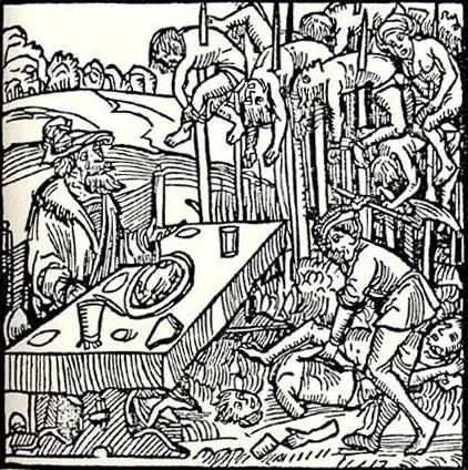 6- El noble con agudo sentido del olfato, en el día de San Bartolomé en 1459, Drácula mando a empalar a 30.000 mercaderes y nobles de Transilvania de la ciudad de Brasov. Para ver como se cumplían sus órdenes, el príncipe hizo que preparen su mesa frente al bosque de los empalados, invitando también a los boyardos al banquete. Mientras comía, Vlad se dio cuenta que uno de los boyardos estaba cubriendo su nariz para evitar el terrible olor de vísceras y sangre. Drácula entonces ordenó que el sensible noble sea empalado en una estaca más alta que el resto para que pueda evitar el olor del resto de empalados.