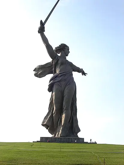 Madre Rusia, en Volgogrado, Rusia. Tiene 82 metros de altura, erigida en cemento reforzado, con excepción de la espada que porta la mujer que simboliza a la patria rusa, y que es de acero inoxidable. Obra de Eugeny Vuchetich, fue inaugurada en 1967 en el Museo Kurgan, construido para conmemorar la batalla de Stalingrado (nombre que recibió la ciudad entre 1925 y 1961)