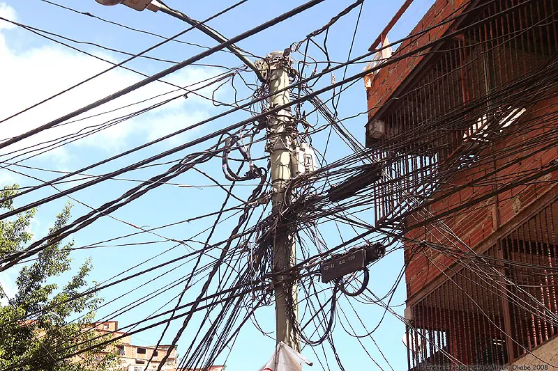 Docenas de cables se conectan al poste eléctrico.