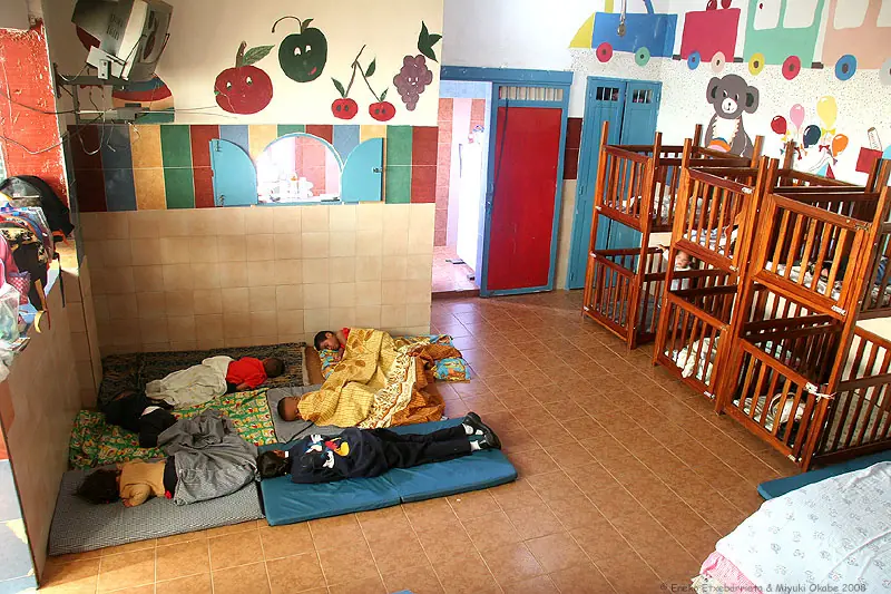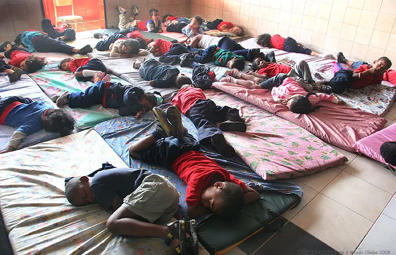 Varios niños y niñas duermen la siesta en uno de los salones.