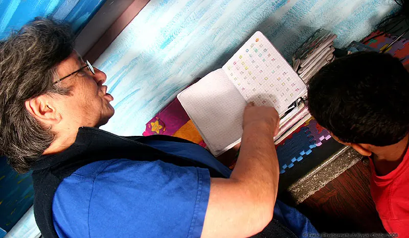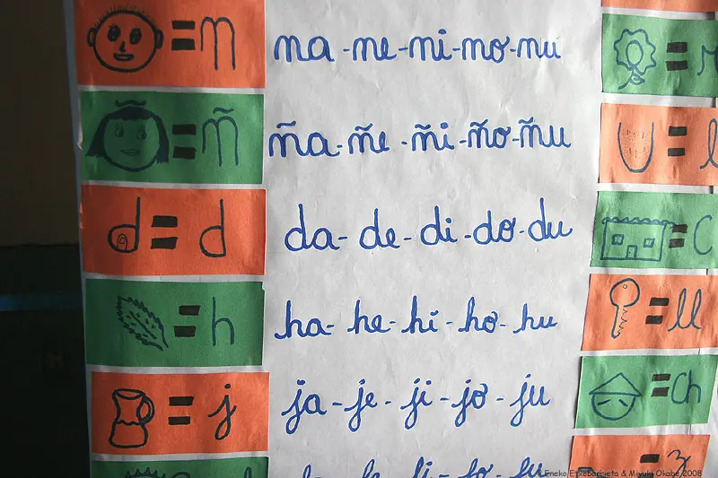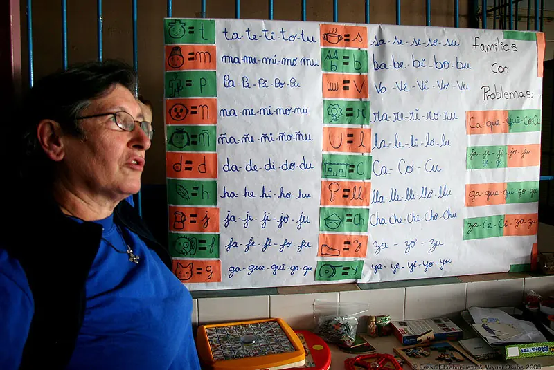 Mirentxu nos lo explica de una manera muy gráfica: "La pe, por ejemplo, es Pepe, que vino como emigrante del oriente de Venezuela y fue atropellado por un todoterreno en Petare. Le llevaron al hospital y le tuvieron que amputar una pierna, y ahora camina con un palo. Mientras cuento la historia, hago que todos los niños la vayan representando: ahora caminamos como Pepe, ahora dibujamos a Pepe."
