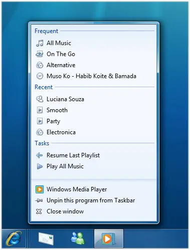 Precionando click derecho en el icono de la reproductora de musica nos muestra el nuevo dispositivo UI a lo que microsoft llama "Jump Lists" (Salto de listas).