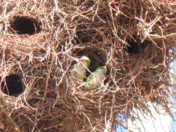 La cotorrita o cotorra gris argentina, también llamada cotorra monje, construye un gran nido formado por palos en las copas de los árboles, como en las palmeras protegidas de Entre Ríos.