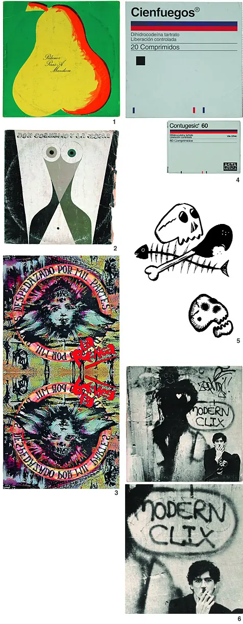 5. Para Buena suerte (1991), el debut de Los Rodríguez, Calamaro quiso dibujar la tapa. Pero sus dibujos (5) fueron rediseñados y firmados (6) por el estudio de Pedro Delgado, a cargo del arte de tapa.