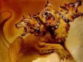 Los espíritus guiados por Caronte llegaban entonces al otro lado del caudal, hasta las puertas del Hades, vigiladas por un horrible y gigantesco perro humanoide de tres cabezas y con cola de serpiente, Cerbero. Pese a su aspecto horrible esta bestia no hacía ningún daño a las sombras de los muertos. Según la mitología, Cerbero era hijo de Tifón y Equidma, y era el guardián de los infiernos. El can asesinaba a cualquier ser vivo que se acercara al Reino de los muertos, salvo en contadas ocasiones, así, Orfeo logró dormirlo gracias a los sones de su música, y Eneas lo durmió gracias a una comida especial preparada por la Sibila. En combate, solamente Hércules fue capaz de derrotarle, después de encadenarlo lo llevó hasta Trezena como uno de sus famosos "Trabajos de Hércules", tras lo cual lo restituyó al infierno. Este ha sido el único periodo en que Cerbero ha abandonado la entrada del reino de Hades.