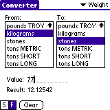 Esta aplicación combina las funciones de una calculadora básica y un conversor de divisas, de modo que todas las operaciones realizadas se presentan en la moneda principal y en otras dos a elegir, que son configurables por el usuario. El programa incluye todas las tasas de cambio de las antiguas monedas de la zona euro, de modo que los nostálgicos y los despistados pueden tener siempre a mano los importes en pesetas. Los cambios vigentes de otras monedas, como el dólar, la libra o el yen, han de ser introducidos manualmente. Dispone de un botón para transferir las cantidades directamente a la aplicación Gastos de PalmOS.