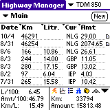 Highway Manager permite controlar varios vehículos independientemente, operar en unidades métricas (litros, km) o imperiales (galones, millas), emplear divisas múltiples (para desplazamientos internacionales) y proporciona informes en modo de tabla o de gráfico histórico de las distintas magnitudes: consumo (l/100 km), kilometraje, coste (euros/100 km) y rendimiento (km/l).