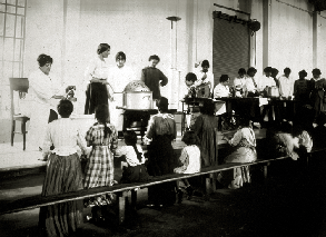Enseñanza de labores domésticas a las inmigrantes en el Hotel. 1914. (Archivo General de la Nación) acerca de la riqueza nacional y descriptivas de la república; asimismo, una oficina dactiloscópica encargada de confeccionar las cédulas de identidad de los inmigrantes, de acuerdo al "moderno sistema Vucetich".