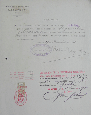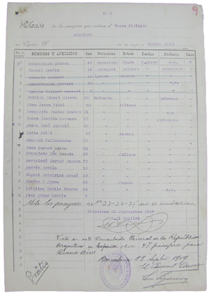 Listas de pasajeros: se confeccionaba en cada uno de los puertos de embarque. Acta de visita e inspección marítima: formulario que se completaba en Buenos Aires, al momento del arribo, por dos visitadores de migraciones, un médico de sanidad y un oficial de prefectura. Allí se dejaba constancia de que tanto el barco como los pasajeros cumplían con las prescripciones de la ley argentina. Asimismo, se consignaban las novedades durante el viaje, tales como nacimientos, enfermedades, etc., si las hubiera habido.