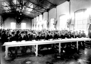 Se habían dispuesto turnos de almuerzo de hasta mil personas cada uno. Al toque de una campana, los inmigrantes se agrupaban en la entrada del comedor, donde un cocinero les repartía las vituallas. Luego ellos se instalaban a lo largo de las mesas a esperar su almuerzo. Este consistía, generalmente, en un plato de sopa abundante, y guiso con carne, puchero, pastas, arroz o estofado.