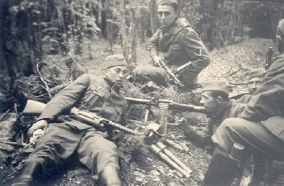 Estos Soldados Alemanes, estan haciendo un minuto de descanso, pertenecen a una Patrulla de Infantería adelantada, en territorio Ruso, se puede apreciar que tienen el MP-34 tienen una Ametralladora Rheinmetall MG-34, en el suelo un par de Granadas de mano, se puede ver, la punta de un Fusil Mauser Karabiner
