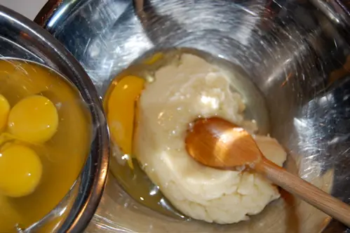 Regresar a la hornalla y cocinar dos o tres minutos, retirar y verter en un bowl, dejar que se entibie y añadir los huevos uno por uno, batiendo (batidora o a mano) y esperando que se homogenice antes de agregar el siguiente huevo.