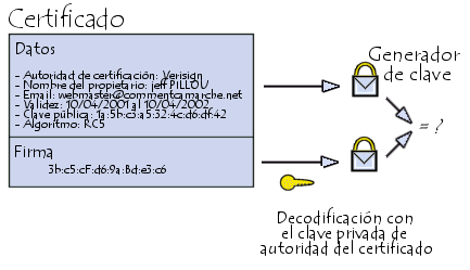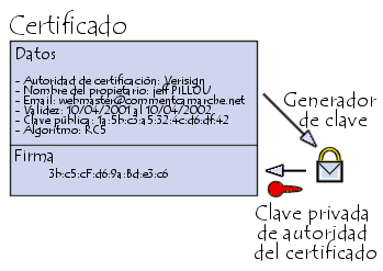 Un certificado permite asociar una clave pública con una entidad (una persona, un equipo, etc.) para garantizar su validez. El certificado es como la tarjeta de identificación de la clave, emitido por una entidad llamada Entidad de certificación (que frecuentemente se abrevia CA, por sus siglas en inglés).