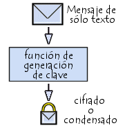 Una función hash es una función que hace posible obtener un hash (también llamado resumen de mensaje) de un texto, es decir, obtener una serie moderadamente corta de caracteres que representan el texto al cual se le aplica esta función hash. La función hash debe ser tal que asocie únicamente un hash con un texto plano (esto significa que la mínima modificación del documento causará una modificación en el hash). Además, debe ser una función unidireccional para que el mensaje original no pueda ser recuperado a partir del hash. Si existiera una forma de encontrar el texto plano desde el hash, se diría que la función hash presenta una "trapdoor".