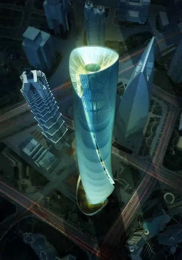 Esta si que no me la creo; esta torre planea medir 632 metros de altura para cuando sea completada. La torre esta organizada como 9 edificios cilíndricos, apilados uno encima del otro. Albergara múltiples oficinas comerciales, hoteles de lujo, casinos y nueve jardines en el cielo.