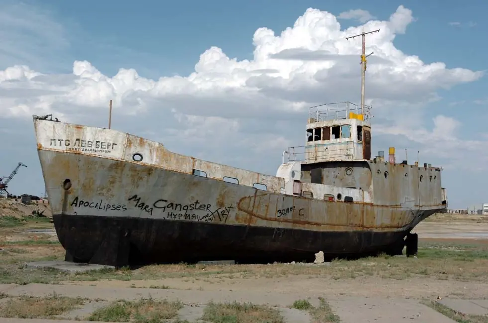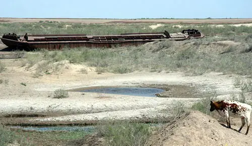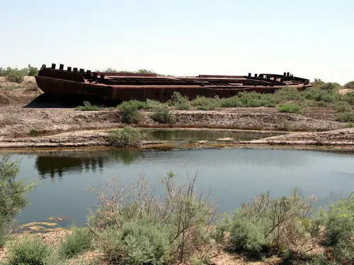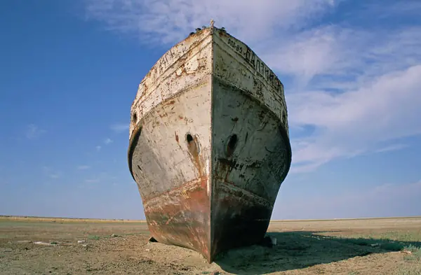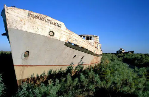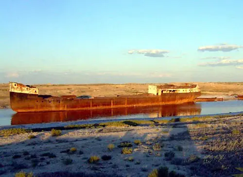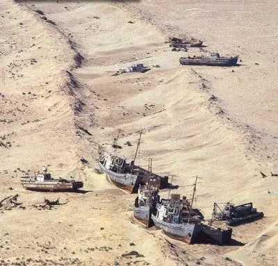 Mar de Aral, en nuestra época actual. La pesca se ha reducido de las 50.000 toneladas de los años 50 a ¡CERO!. El volumen del lago se ha reducido en un 80% contando ahora con apenas 200 km3 y su salinidad, de 1 gramo por litro en los 50 llega ahora en algunos puntos a 100 gramos por litro, su nivel, ha disminuido aproximadamente 25 metros. De todas las especies que habitaban el lago, tan solo quedan un par en algunos puntos concretos… y que tienen las horas contadas. El nivel freático ha descendido a más de cincuenta metros de profundidad y la mayoría de pozos para el riego han quedado inservibles. Seis millones de hectáreas de tierras agrícolas han sido destruidas como consecuencia de la salinización y la desertificación. Donde antes había un mar vivo, ahora descansan sobre su lecho blanco y yermo centenares de barcos viejos y oxidados, con la única y eterna función, hasta que la podredumbre los haga desaparecer por completo, de hacer sombra a los camellos cansados del que ahora se podría llamar, desierto de Aral. Las tormentas de viento y polvo, arrastran la sal de los lechos secos hasta más de doscientos kilómetros a la redonda, arruinando para siempre las tierras ante cualquier intento de cultivo. Los pueblos y las ciudades de las riberas han quedado prácticamente desiertas y millones de personas, al igual que las aguas del lago, se han evaporado del lugar.