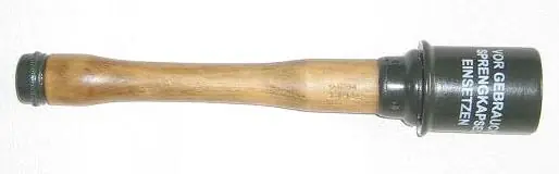 Largo: 356 mm. Material: Mango de madera y envuelta explosiva metálica.