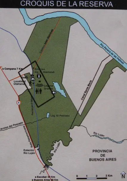 DESCRIPCIÓN GENERAL: En los últimos años los Bajos de Otamendi, ubicados al sur de Campana en el nordeste bonaerense, se fueron convirtiendo en un lugar de encuentro para observadores de aves y naturalistas en general. Es que un área como ésta de considerable extensión, con variados ambientes y fácil acceso, configura un gran atractivo donde se refugia una buena parte de la fauna regional. Posiblemente sorprenda considerar este lugar parte del Delta del Paraná, habitualmente delimitado al sur por el Paraná y luego por el Paraná de las Palmas. Pero aquí estamos considerando los límites naturales dibujados por procesos geológicos. La retracción del mar, que en tiempos cuaternarios ocupaba una amplia bahía interior (actual Delta y estuario del Paraná) dejó al descubierto el borde de las tierras altas, su antigua costa. Ese límite está a la vista hoy en día en las barrancas, que se continúan hacia el sudeste, paralelas a la costa rioplatense, y donde se desarrollaron los Talares y se asentaron las ciudades. El lecho marino vecino a la costa, forma una terraza baja entre la barranca y el río Paraná. Esta siguió similares procesos de formación a los experimentados por buena parte del Delta, enriqueciéndose con los aportes de sedimentos en cada inundación. Si observamos el perfil del relieve a la altura de Otamendi, veríamos que sobre el Paraná de las Palmas tiene la forma típica de una isla del Delta, con un albardón costero alto y una zona baja en el centro, que se inunda periódicamente con las crecidas del río. El albardón está ocupado por una Selva Ribereña o en Galería, con numerosas especies de árboles de estirpe subtropical. En los bajos se instalan numerosas comunidades vegetales acuáticas (Juncales, totorales, pajonales, etc. que son refugio de Carpinchos, Coipos, el injustamente perseguido Ciervo de los Pantanos y una rica avifauna. En los riachos que desembocan en el Paraná de las Palmas, suelen verse Tortugas acuáticas y Lobitos de Río. Sobre los terrenos inclinados de la barranca se asienta una flora y fauna muy diferente, característica de ambientes más secos . Hallaremos allí los bosques de Tala, refugio de numerosas aves y pequeños mamíferos. Más arriba, ya sobre la llanura pampeana, se mantiene un sector de pastizal natural, actualmente en recuperación, dado que esas tierras fueron intensamente aprovechadas para la agricultura antes de la creación de la Reserva.