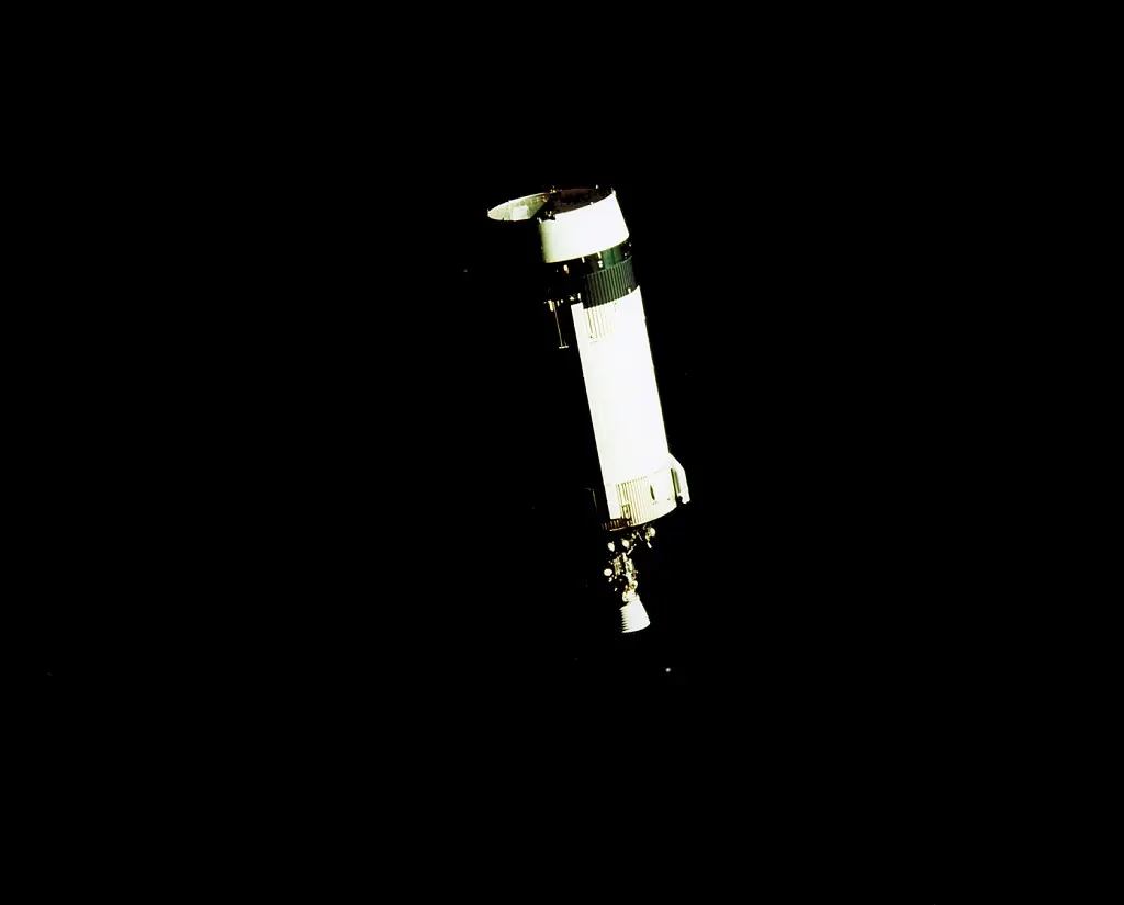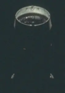 En realidad se trata simplemente de la tercera etapa del cohete Saturno V, llamada SIV-B, que colocaba a la nave en rumbo hacia la Luna. Casi con toda probabilidad, la imagen superior proviene de la versión de baja resolución de esta fotografía, y ha sido distorsionada tanto como la imagen de la "cúpula" vista anteriormente. La versión de alta resolución resuelve, una vez más, el "misterio": al estar en penumbra, la etapa es difícil de reconocer (lo que, de todas formas, no hubiera impedido que los ufólogos crédulos se molestasen en investigar el caso, en lugar de calificarlo de inexplicable a las primeras de cambio). A la derecha puede ver la etapa SIV-B más iluminada, en otra fotografía: