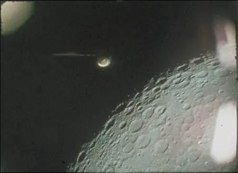 Poniendo de nuevo en evidencia a los ufólogos más crédulos y su capacidad de investigación, la siguiente es otra imagen que muestra el mástil del EVA floodlight, y que es confundida por algunos de ellos con un "ovni cilíndrico". Algunos llegan incluso a hablar de "objeto aéreo en forma de puro suspendido sobre la superficie lunar". El objeto que se aprecia abajo a la izquierda es el espectrómetro de masa, que, una vez situado el módulo de comando en órbita, también se extendía mediante otro mástil. (La imagen está tomada desde una de las ventanas del módulo, en órbita lunar):