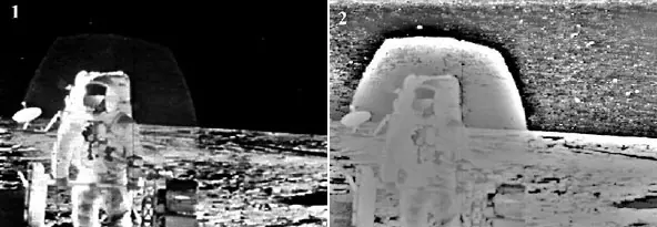 De forma similar a la imagen del visor de Aldrin donde algunos creen ver extrañas estructuras o focos de un estudio (que son en realidad la bandera estadounidense y un experimento instalado en la superficie por los astronautas), en otra fotografía el visor de Pete Conrad parece mostrar un "artefacto", de nuevo según Richard Hoagland: