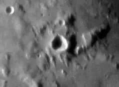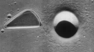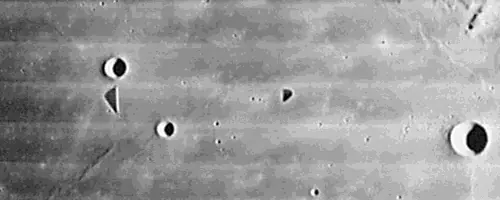 Volviendo a las imágenes de la superficie lunar captadas por otras sondas, la siguiente sombra triangular cercana al cráter Aristarchus, captada por la sonda Lunar Orbiter 4, llama la atención por su aparente artificialidad. Alguien ha añadido sobre la imagen unas líneas para denotar una supuesta relación geométrica entre la sombra y el cráter: