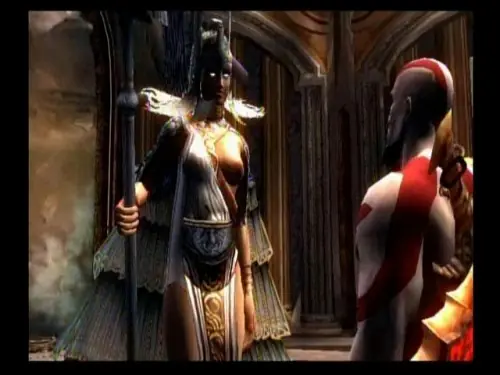 Kratos no entiende por qué Atenea se ha sacrificado. Él quiere destruir a Zeus, no al Olimpo, pero Atenea le dice que Zeus es su padre. Y con su último suspiro le dice a Kratos que Zeus quiere matar a su hijo (con Ares muerto, Kratos y Hercules que no aparece hata el juego numero 3 son los unicos hijos que tiene Zeus). Por ello Zeus está temeroso que Kratos le matase, por el mismo motivo por el que él tuvo que acabar con su padre, el Titán Cronos, quien también había luchado con su padre, Urano. Zeus decidió no arriesgarse y matar él mismo a Kratos para acabar con el ciclo de "hijo mata al padre". Revelado esto, la diosa muere y se volatiliza.
