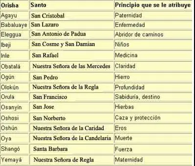 Tabla de orishas con su respectivo santo católico: