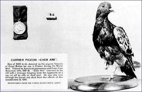 Otro héroe de guerra, exactamente de la I Guerra Mundial, fue una paloma llamada Cher Ami (querido amigo). Salvó las vidas de muchos soldados conocidos como el “Batallón Perdido,” perteneciente a la 77ª División de Nueva York del Ejército de los Estados Unidos. Durante una batalla en Francia, el batallón quedó aislado del resto de las tropas aliadas y los soldados fueron rodeados por el enemigo. De pronto, su propia artillería, sin saber que sus compañeros estaban ahí, les comenzó a disparar. Tras mandar fallidamente dos palomas que fueron derribadas, su última esperanza era una paloma mensajera, Cher Ami. El mensaje que llevaba decía: “Nuestra propia artillería esta tendiendo una cortina de fuego sobre nosotros. ¡Por el amor de Dios, detengan el fuego!” Los hombres del Batallón vieron como soltaban a Cher Ami y la derribaban, milagrosamente en un instante esta ave ya estaba en el aire de nuevo. Las esperanzas resurgieron pero, mientras volaba sobre el fuego enemigo, Cher Ami recibió un balazo en la pierna y otro en el pecho. Aún así, continuó con su vuelo y aún gravemente herida, consiguió llevar el mensaje y salvar las vidas de estos hombres.