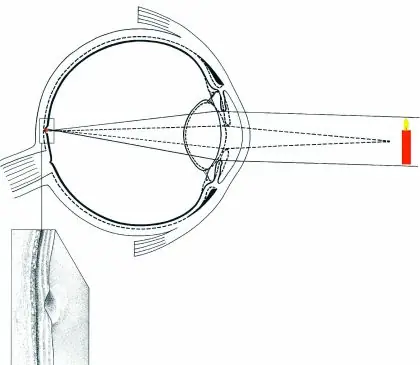 Pero quedémonos con el valor umbral, 2 puntos situados exactamente a 4 micras. Esos puntos de la imagen proyectada llegan a la retina a partir del sistema de enfoque. Este sistema de enfoque produce una imagen más pequeña e invertida (es decir, lo que está arriba se proyecta abajo y lo que está a la izquierda se proyecta a la derecha). Por tanto, si en la vida real el punto A está un poco más alto que B, en la retina B queda un poco más alto que A.