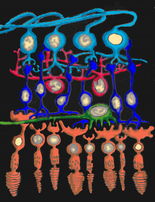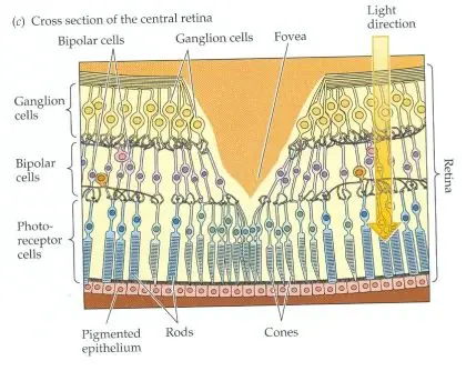 Fijense en este esquema: las células alargadas de abajo son los receptores. La fóvea se ve como una depresión con forma de cuña, y justo a ese nivel, los receptores, en este caso conos (que parecen como zanahorias azules en este dibujo) están muy juntos unos a otros.