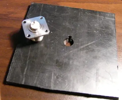 Ahora nos conseguimos una pieza de plastico de 110mm de lado, la perforamos segun la figura para que entre la parte de atras del conector "N"