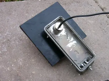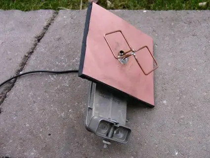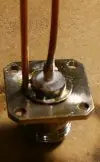 La parte mas importante es el conector "N" plateado como se ve en la fotografia, sobre el mismo construiremos el "iluminador" que es nada menos que una antenita biquad montada sobre el conector y con una plaqueta de circuito impreso de cobre como reflector.