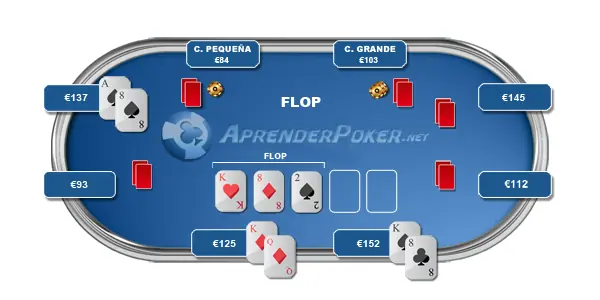 Después de ver el flop, se realiza una segunda ronda de apuestas. En esta ocasión será el jugador que ocupa la posición de la ciega pequeña, o aquél que estuviera más próximo a éste si la ciega pequeña no siguiera en la mano, quien empezaría a hablar. Para este jugador no cabe la opción que tenía antes de “igualar” ya que es el el primero en tener la posibilidad de apostar y no hay ninguna ciega obligatoria. Así pues, los jugadores deberán pasarse (check), apostar (bet), retirarse (fold) si alguien hubiera apostado y no quisiéramos seguir en la mano. Cuando alguien apuesta, las opciones ya solo son igualar (call), subir esa apuesta (raise) o retirarse (fold). Y es que en el momento que alguien apuesta ya no cabe la posibilidad de pasarse y solo se puede igualar, subir o retirarse.