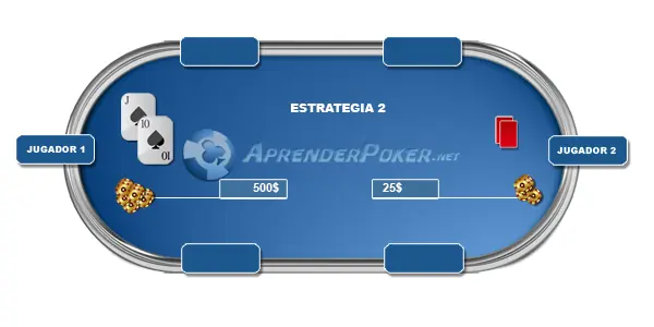 Supongamos que las apuestas ciegas son entre los 2 y 4 dólares, que tenemos USD 500, y que nuestro oponente tiene sólo USD 25. Nuestra posición es la de la ciega mayor o “big blind”, tenemos JTs y el rival hace "all-in" desde la primera de las posiciones. Todos los demás deciden pasar. Muy probablemente, nosotros deberíamos pasar también, pues nuestra posición es la menos fuerte; y si arriesgamos USD 21 para poder quedarnos con sus últimos 25 dólares, no hacemos un buen negocio, pues el riesgo sería demasiado elevado. Pero si el rival poseyera, en cambio, USD 500, las cosas cambian. Apostar constituiría una buena opción: arriesgamos 21 dólares para ganar 500. ¿En qué basaríamos la decisión? Decidiríamos apostar (o, si conviene, dejar de hacerlo), de acuerdo con la manera en la que nuestro rival juegue una vez que el flop se haya descubierto.