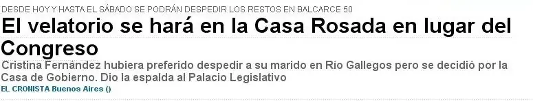 El funeral se decide realizar en Casa Rosada y no en el salón del Congreso donde históricamente son velados los ex presidentes, ya que dicho salón, casualmente permanece CERRADO POR REFACCIONES en estos días. Por ende, el circuito normal que hacía la gente alrededor del cajón para tocarlo y dejarle flores, es imposible de llevar a cabo. Un fuerte vallado separa a la gente que ingresa a Casa Rosada del ataúd de Néstor
